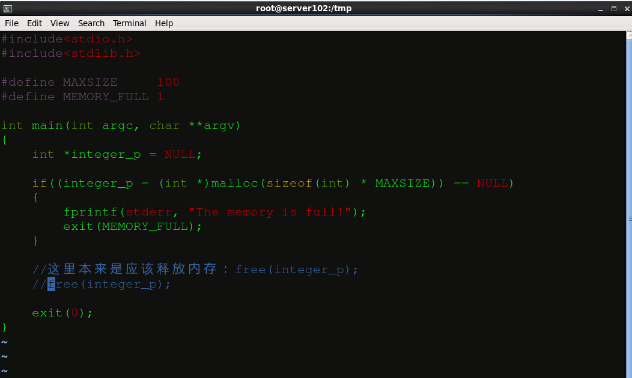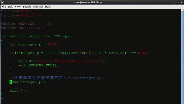 為了體現valgrind 的檢錯功能,我們故意編寫一個只malloc沒有free的C程序: