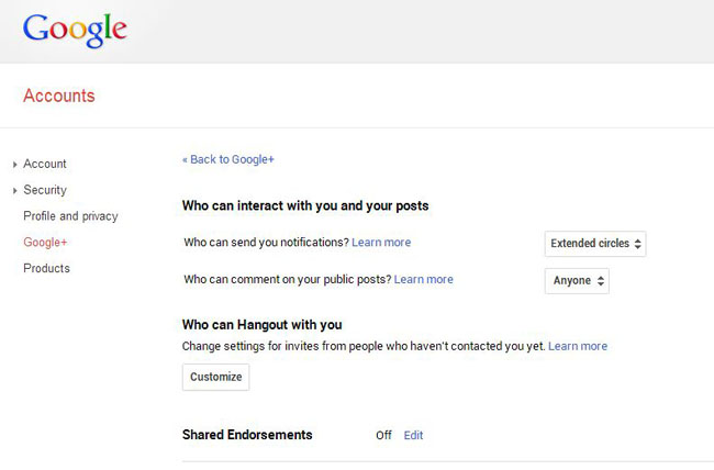谷歌反復強調(diào)一點:用戶始終能夠控制所分享的內(nèi)容。所以,如果你不喜歡這樣,那么可以進入 Google+ 的 Shared Endorsements setting 里面修改。你只要花一點時間,把該功能關閉即可: