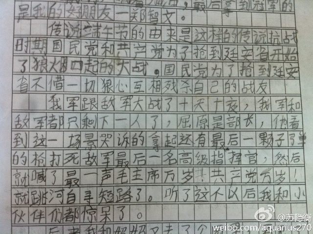 出處:2013年6月,一段講述端午節(jié)由來的小學(xué)作文內(nèi)容截圖在微博網(wǎng)友中熱傳。這篇文章,最早由新浪微博網(wǎng)友“蘇隱衡”發(fā)表于2011年11月14日。援引其中的一句話“我和小伙伴們都驚呆了”被作為網(wǎng)絡(luò)流行語迅速傳播,短時間內(nèi)成為了熱門話題。
