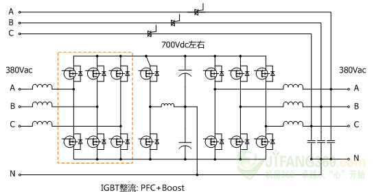 而到上世紀90年代,第三代溝槽型IGBT面世,其耐壓能力提升至1200V,促使了UPS技術的革新。通過整流側高頻升壓電路將母線電壓提升至700V左右,逆變器輸出電壓可以做到380V,輸出變壓器得以取消。而這種整流逆變電路都工作在高頻(幾kHz以上)且沒有輸出變壓器的UPS就被稱為高頻UPS。圖-2所示為一典型的高頻機拓撲。
