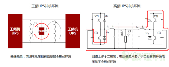 實際上,變壓器的設計反而增大了環流的風險。圖-3所示為兩類機型的環流路徑。工頻機UPS的并聯就是變壓器的直接并聯,整條回路上沒有器件限制,電壓的偏差很容易產生環流。而高頻機的環流路徑上具備多個二極管,小于2V的電壓差根本形不成環流。