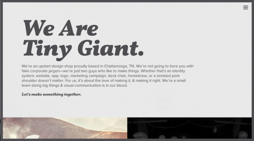 2014年,字體在許多網(wǎng)站設(shè)計(jì)中發(fā)揮重要作用,我未發(fā)現(xiàn)這種趨勢(shì)在短期內(nèi)改變的跡象。可是2015年,我看到網(wǎng)站中的標(biāo)題和字體變得越來(lái)越大。夸張地說(shuō),就連天上的飛機(jī)可能都能看到地面上的字。當(dāng)你訪問(wèn)Tiny Giant的網(wǎng)站時(shí),你會(huì)看到很大的字體。這實(shí)際上是一種聲明,讓你很難錯(cuò)過(guò)。大字體將繼續(xù)在2015年的網(wǎng)站設(shè)計(jì)中發(fā)揮重要作用,成為確保提高訪客視覺(jué)層次的方法。訪客首先會(huì)看到最大的字體,因?yàn)槟菚?huì)首先吸引你的注意力。