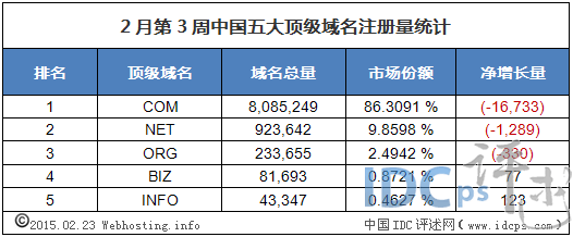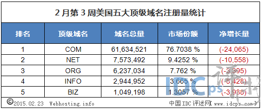(圖1)2月第3周中美五大頂級域名注冊量統計(截至2015-02-23)