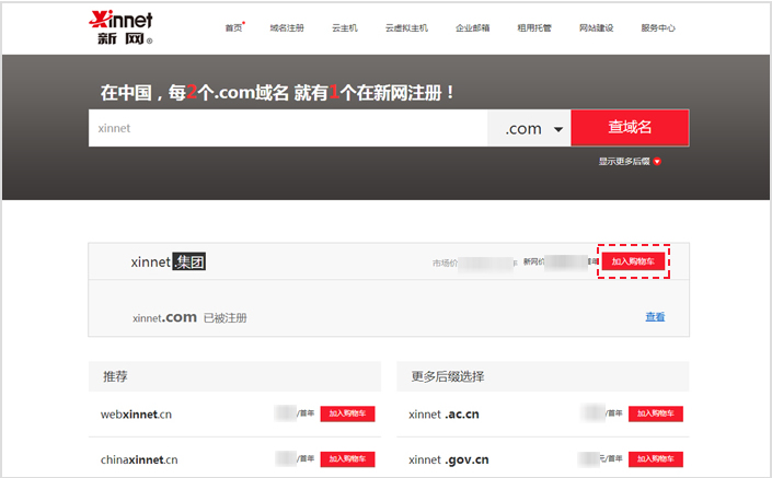 第二步:在【域名查詢結果頁】,將該域名【加入購物車】
