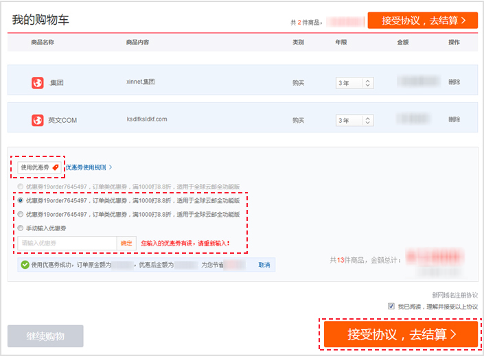第五步:點擊【使用優惠券】,選擇已有的優惠券或手動輸入優惠券,確定后,點擊【接受協議,去結算】