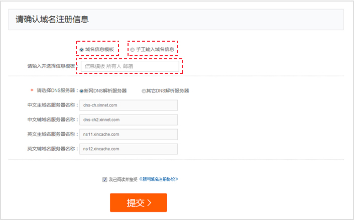 第六步:填寫域名信息模板已有域名信息模板的,選擇【域名信息模板】,輸入關鍵字(信息模板名稱、所有人、郵箱)查找模板;沒有域名信息模板的,選擇【手工輸入域名信息】,填寫模板信息