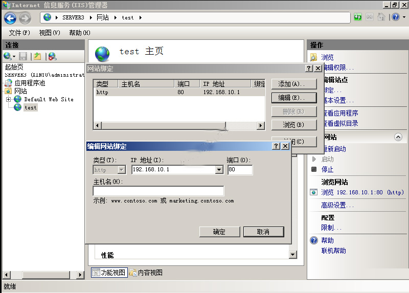 如果你想修改網站的綁定的IP地址或者域名,你可以選中站點,然后右健,有一個編輯綁定,可以在這里修改。