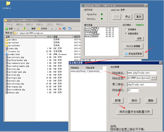 2、將解壓的wordpress文件夾復制到phpstudy的根目錄(圖中phpstudy根目錄是c:\phpstudy\WWW),然后按照圖中所示修改網站目錄,然后重啟phpstudy。