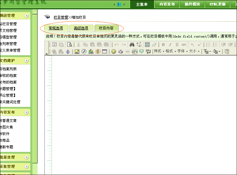 6、欄目內(nèi)容,對于大多數(shù)據(jù)欄目而言,這一項可以不需要填寫,通常如果用于公司簡介等簡單頁面,可以直接在欄目里填寫內(nèi)容,欄目模板中用{dede:field.content/}調(diào)用。