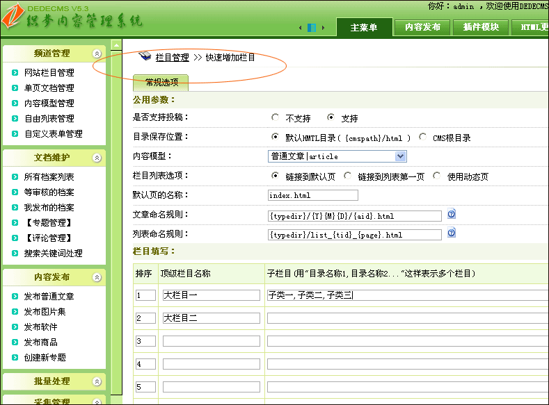 7、快速創(chuàng)建欄目--如果你不需要設(shè)置復(fù)雜的欄目參數(shù),可以用快速創(chuàng)建欄目的模式創(chuàng)建二級的欄目,當(dāng)然如果你要創(chuàng)建更深層次的目錄,則必須單獨創(chuàng)建。