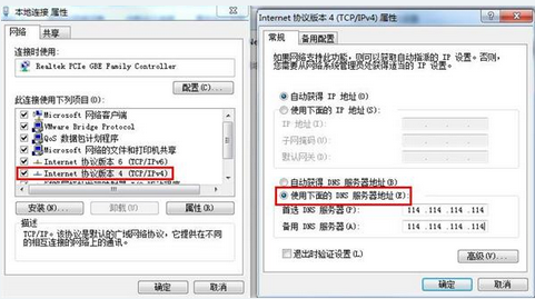 4、這個時候可以雙擊“Internet協議版本4(TCP/IPv4)”,并直接選擇“使用下面的DNS服務器地址”,并把首選DNS服務器和備用DNS服務器設置為“114.114.114.114”。如下圖: