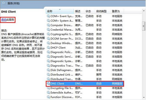 6、需要找到“DNS Client”項,并直接點擊左上角的“啟動此服務”,重啟電腦就行了。如下圖: