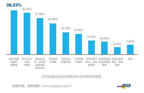 另外,調研還顯示,簽約率同比小幅上升,關于尚未簽約的原因,“薪水/待遇未達到期望值”仍是毀約首要因素,比例為38.23%。其次是“職位/工作內容不喜歡”和“離畢業還早,還有機會拿到更好的offer”,占比分別為35.59%和31.36%。