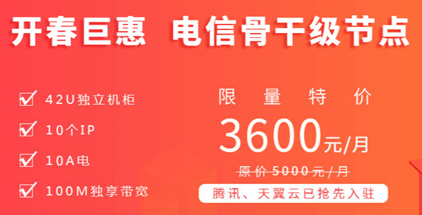 億恩科技特推出IDC電信機柜特價優惠活動,42U標準機柜/10個ip/10A電/100M帶寬,特價低至3600元/月。