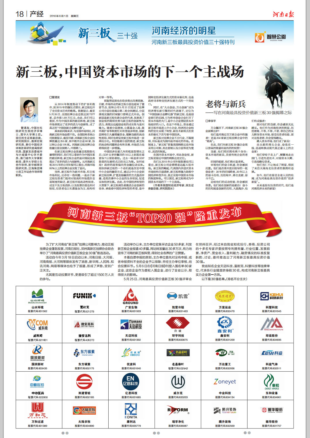 為了擴大河南省“新三板”掛牌公司影響力,推動三板掛牌企業蓬勃發展,河南日報社、鄭州高新區掛牌協會聯合舉辦了“河南最具投資價值新三板企業30強”推選活動。能夠入選河南新三板“TOP30強”,都是各個行業中的翹楚,代表了河南的最高水平。