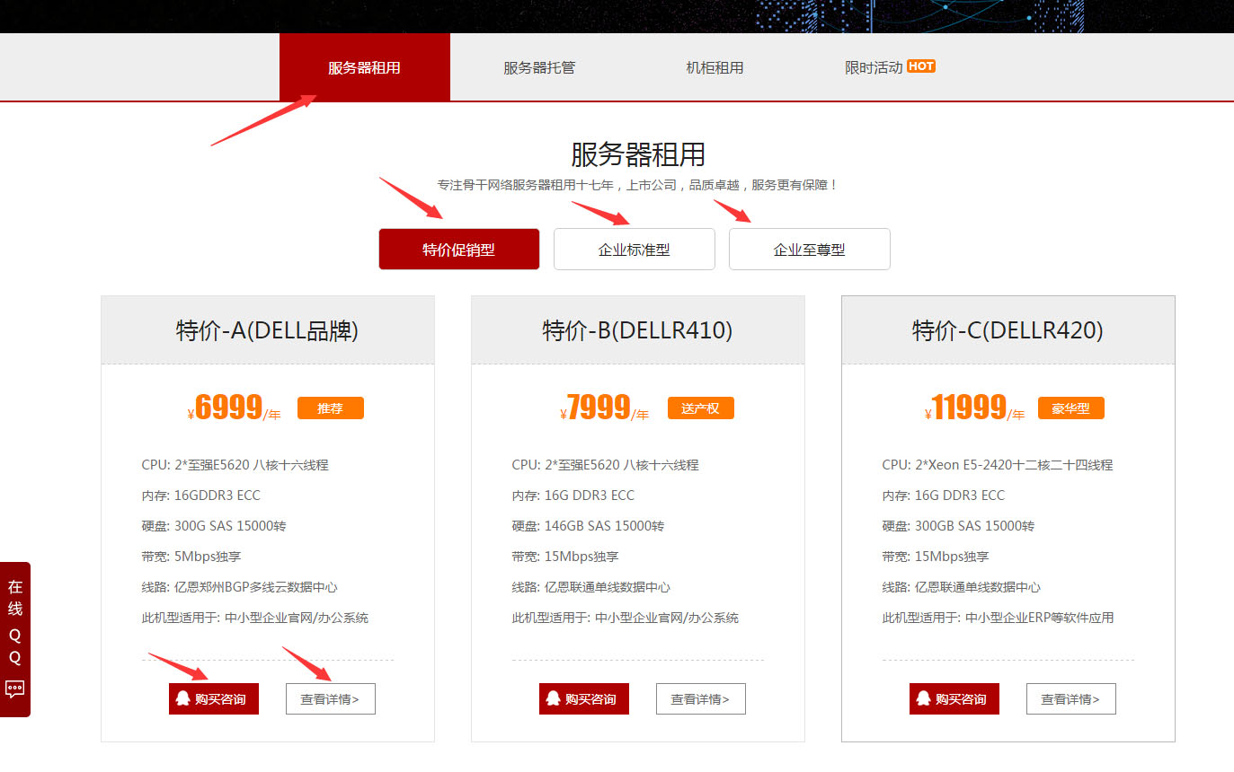 服務器租用有特價促銷型、企業標準型、企業至尊型等推薦對應配置和價格,可以點擊購買咨詢,有相關銷售經理給您辦理后續服務。