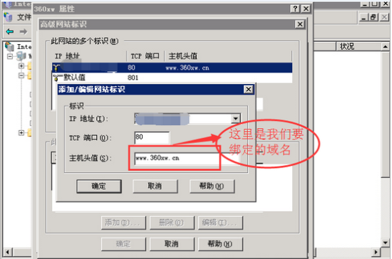第三步,進入“高級網站標識”屬性面板后,點擊選擇“添加”按鈕,出現“添加\編輯網站標識”的對話框,保持“IP地址”默認值不變,將“TCP端口”設置成“80”,“主機頭值”是你要綁定的域名,設置完成后點擊“確定”按鈕保存即可。